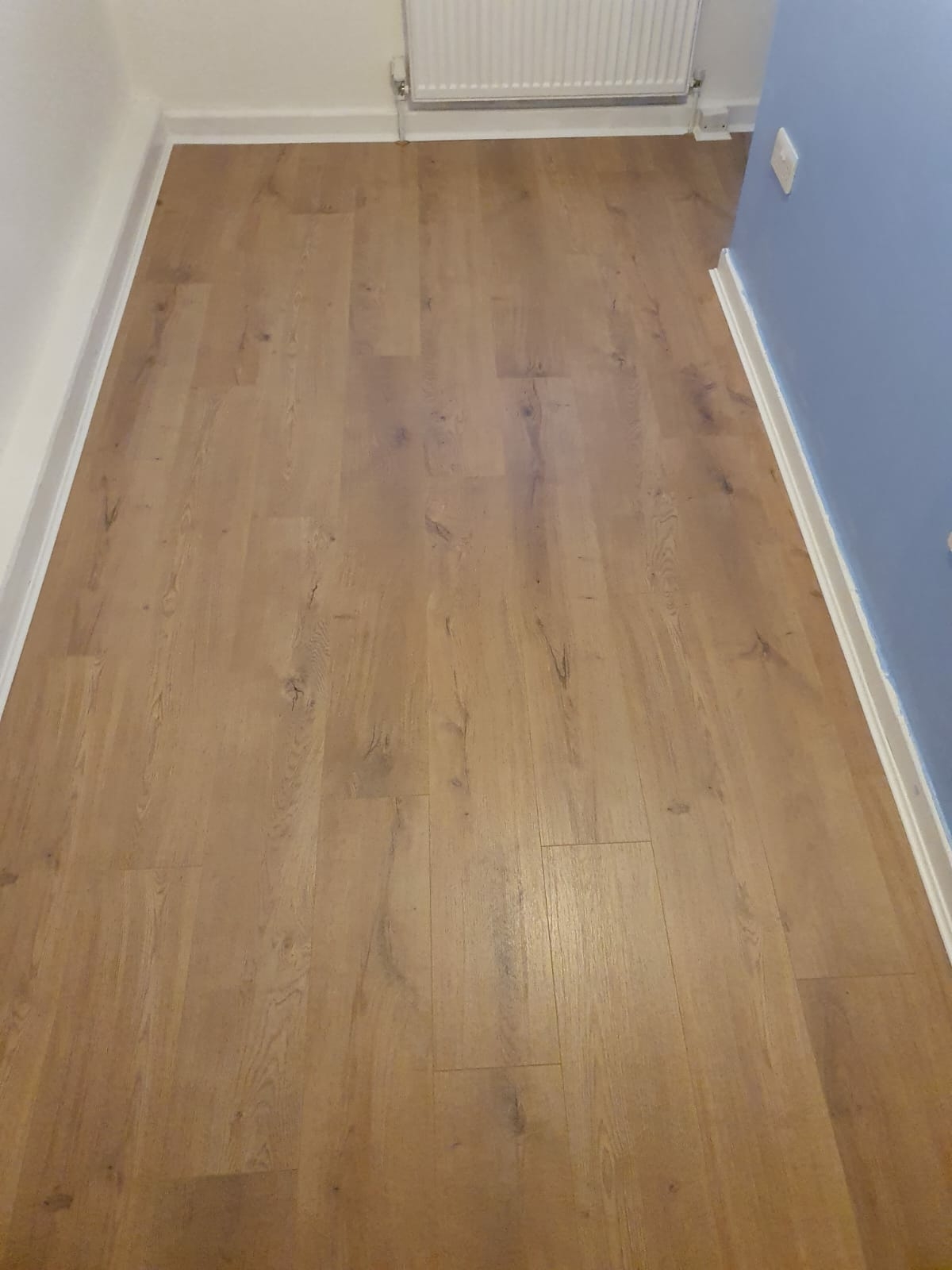 An older flat in SE16 near Bermondsey with a damaged subfloor in the hallway and bedroom. The existing floorboards in parts had shifted and the laminate on top was lifting. We replaced the damaged boards, laid new laminate over the whole area, fitted beading, trimmed the doors, and left the floor level throughout.